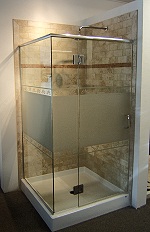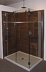 | Here (left) is a new display at Northport Bath's showroom we did using a 42" x 42" Double Threshold Base, 3/8" glass with Decotherm design and a header. | |||||||||||||||||||||||||||||||||||||