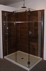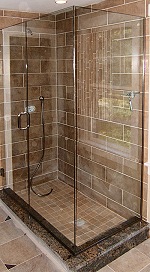 | The shower at right has a custom "mud" base, and tiled walls. The curb has been "capped" with granite. Our 3/8" frameless enclosure was installed over the granite. Curbs can tiled, capped with granite, corian, marble, or any of the manufactured stones. Remember to tip the tiles or granite into the shower so the water drains back. You would be surprised at how many we see that are tipped the wrong way. | |||||||||||