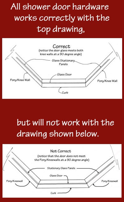 Neo angle enclosures require special consideration if knee/pony/half walls are involved. The vertical face of these walls should be framed and tiled so that the door glass meets these walls at a 90 degree angle. Any other angle presents problems for us (or any other glass installer). Click on left drawing.